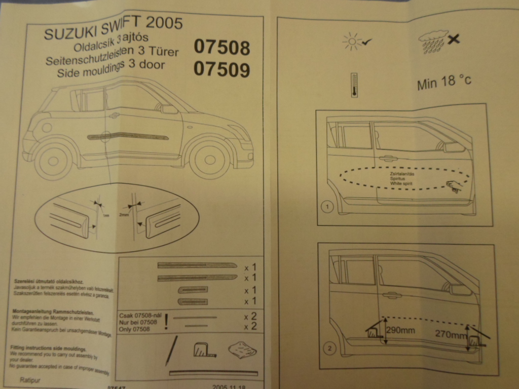 Suzuki Swift díszléc készlet 2005-től a 3 ajtós modellekhez. 2db ajtódíszléc+2db hátsó sárvédő díszléc.